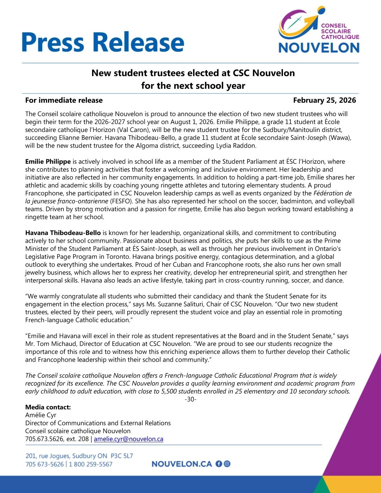 February 25, 2026 Rick Labbe New student trustees elected at CSC Nouvelon for the next school year February 25, 2026 Rick Labbe Rick Labbe