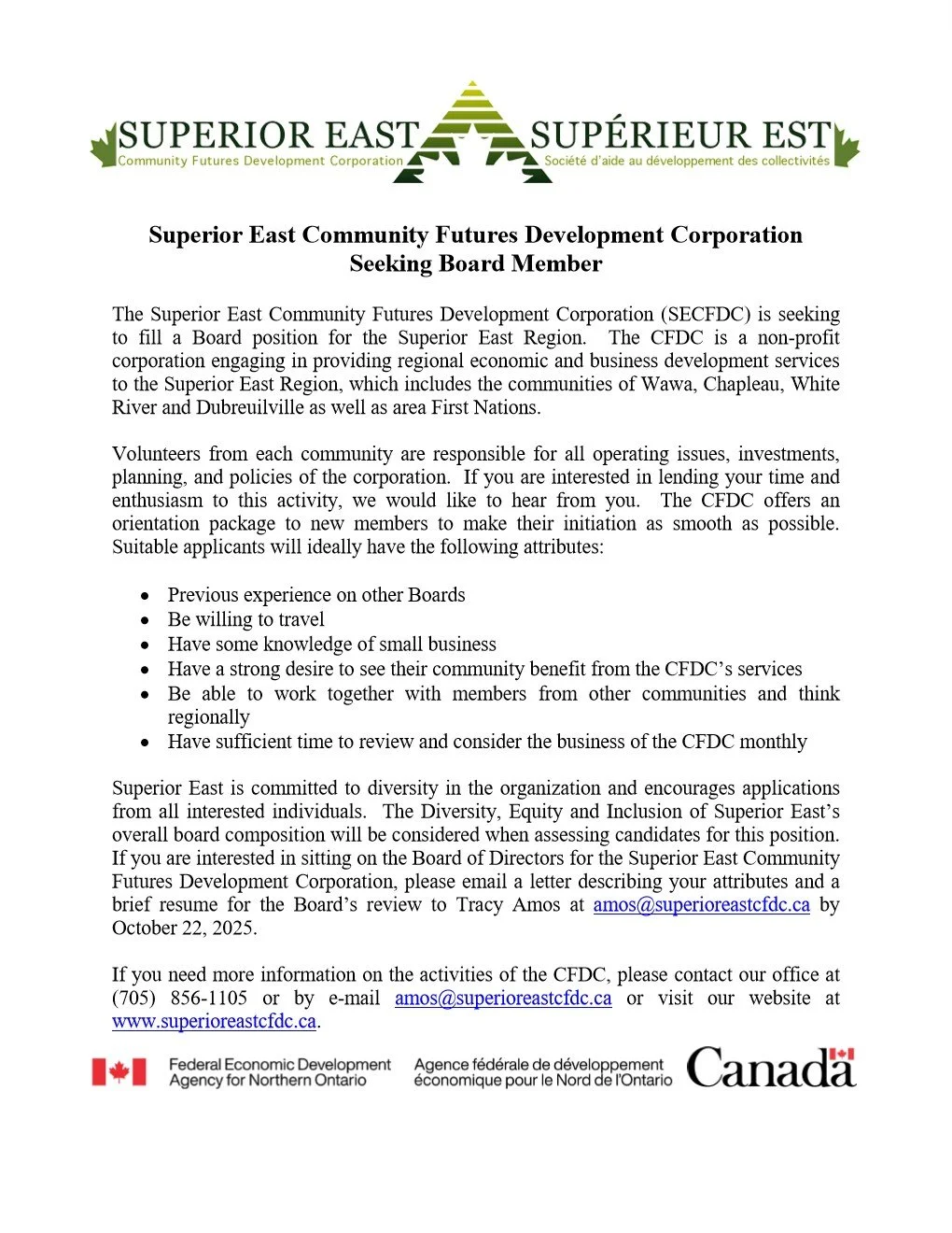 The Township of White River's seeking a Chief Administrative Officer and Clerk. Email cao@whiteriver.ca by 3 pm Thursday, October 17th.