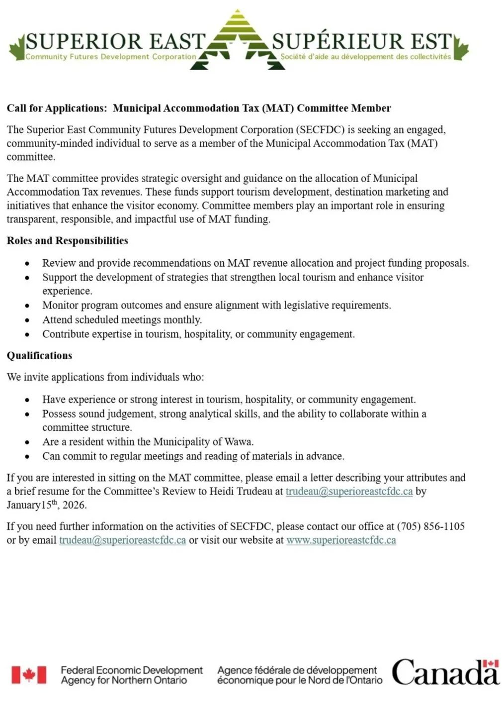 The Superior East Community Futures Development Corporation's looking for members for its Municipal Accommodation Tax Committee in Wawa. Send resume and cover letter to Heidi Trudeau by emailing trudeau@superioreastcfdc.ca by Thursday, January 15th.